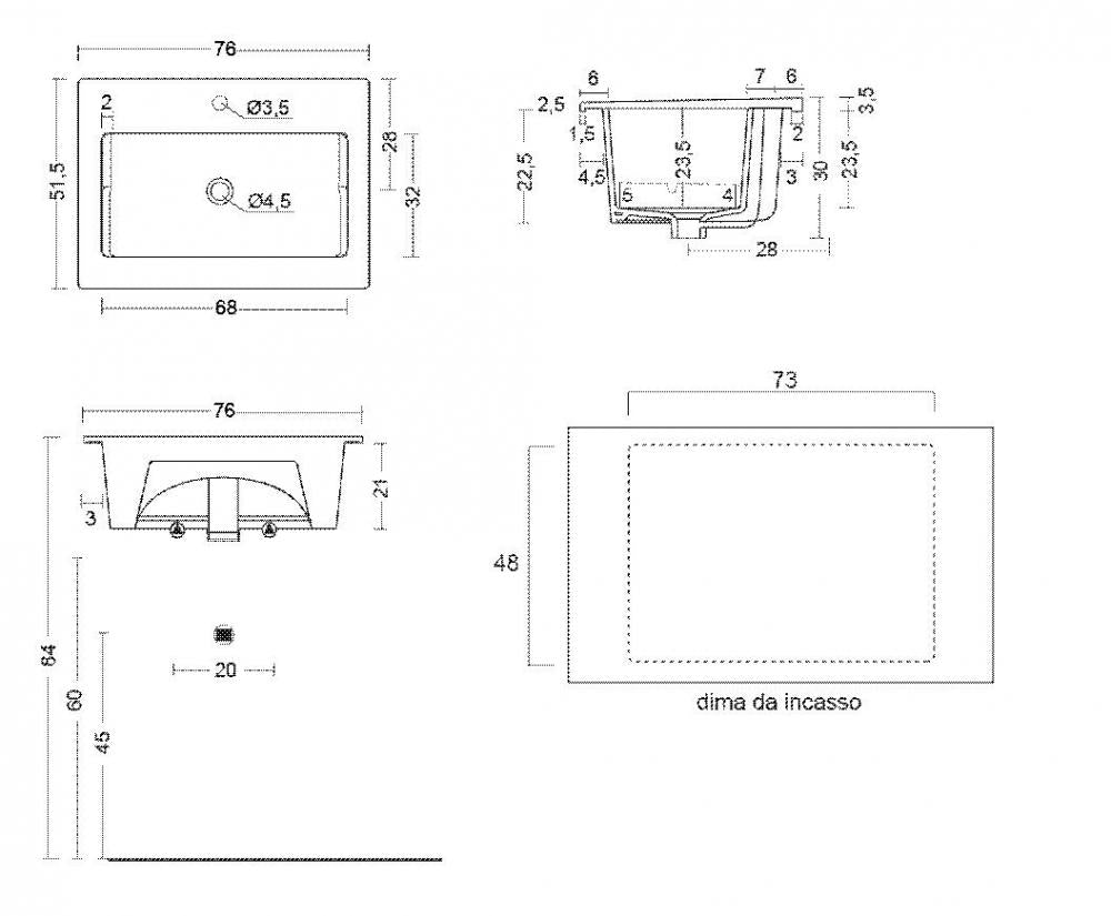 LAVABO IN CERAMICA MULTIUSO JOLLY 75 SM CERAMICHE LARGHEZZA CM.76 PROFONDITA' CM.51,5